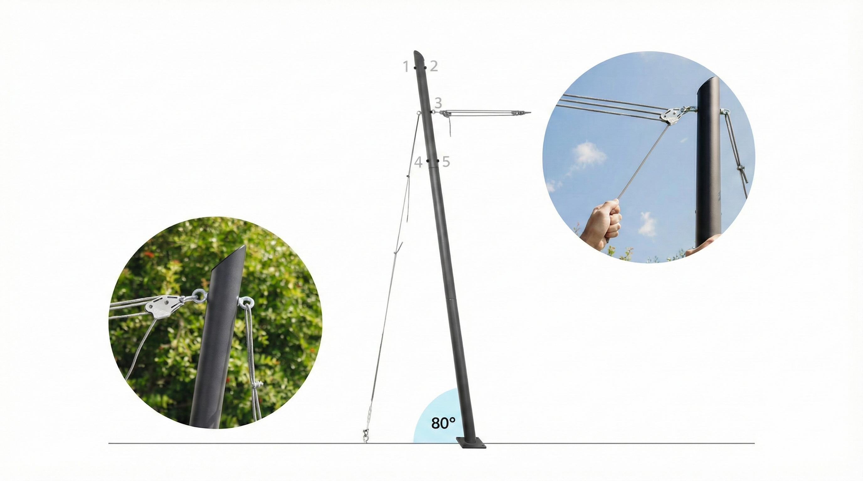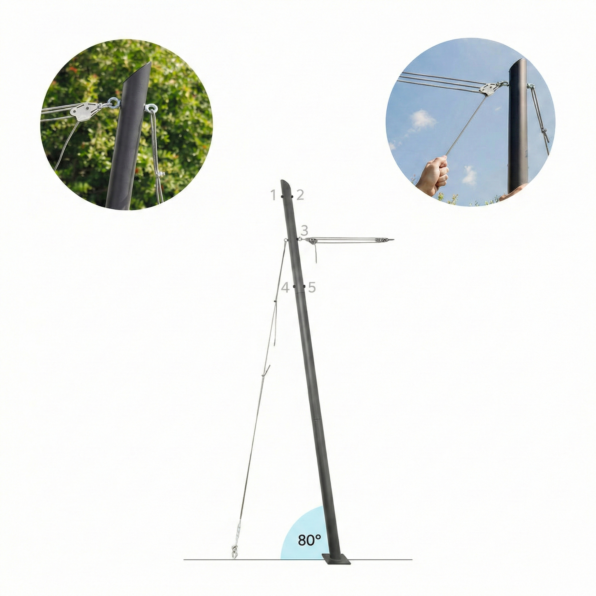 Vytvorte si na záhrade dokonalý tieň s touto inovatívnou tyčou, ktorá ponúka 5 nastaviteľných kotviacich bodov pre maximálnu flexibilitu. Sklon 80° eliminuje potrebu podpier až do 20 m², čím zjednodušuje inštaláciu. Premente svoj vonkajší priestor na oázu pokoja s týmto praktickým riešením.