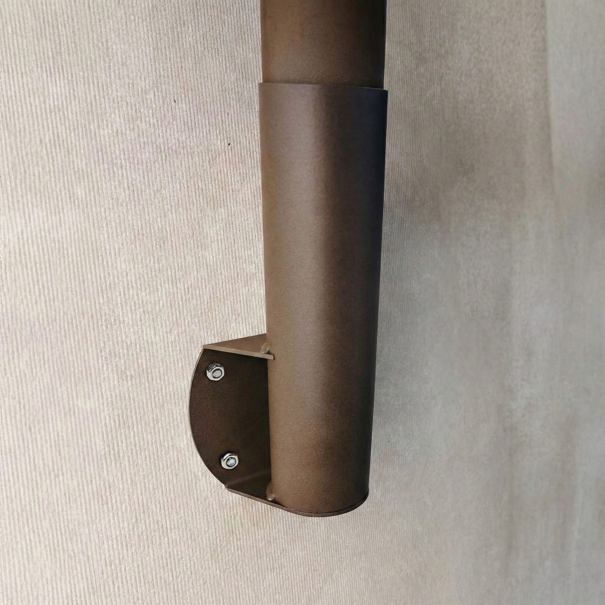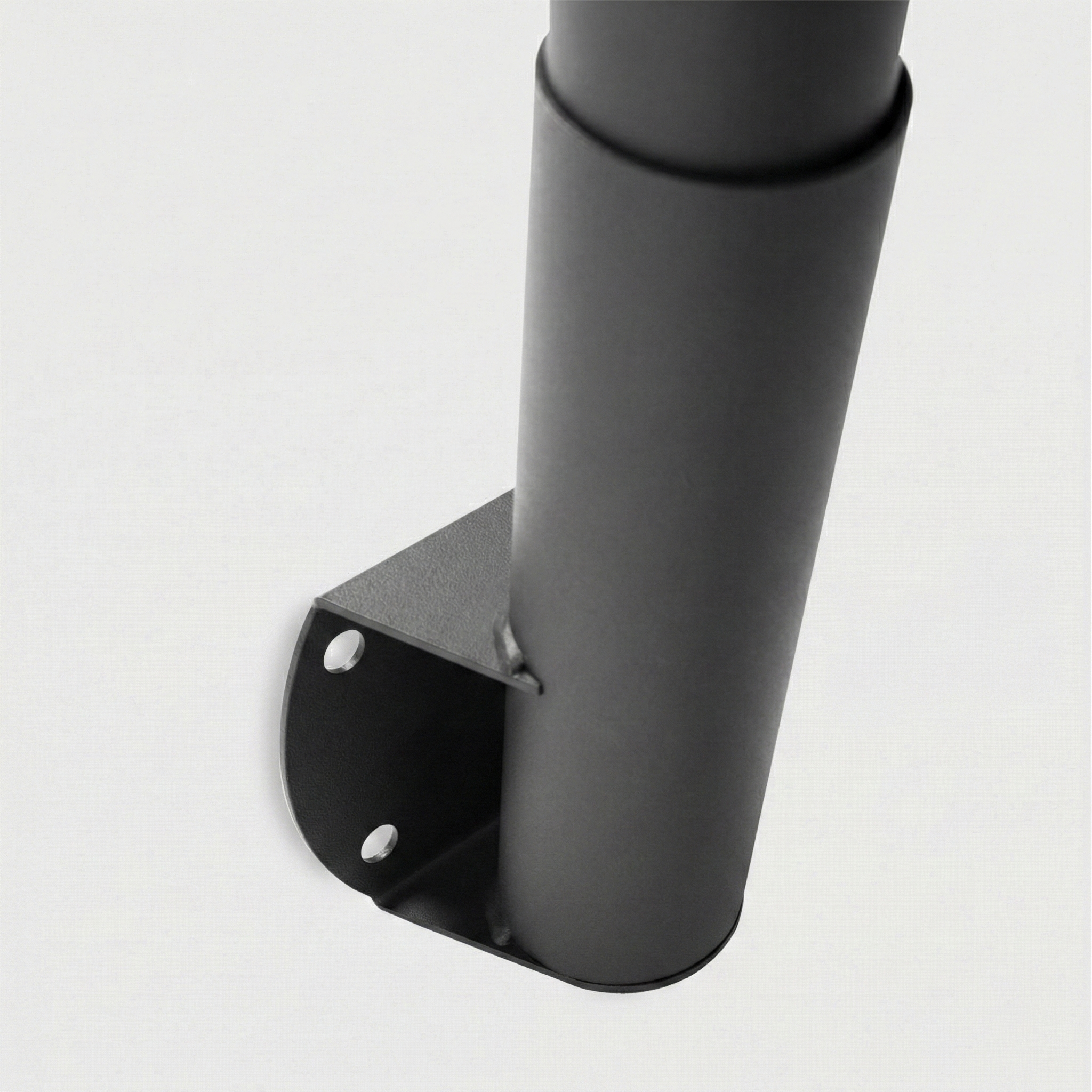 • Oceľová stenná príruba Umožňuje pripevniť kotviaci stĺp priamo na stenu alebo múrik o výške minimálne 35-40 cm. Je to ideálne riešenie pre terasy alebo plochy, kde nie je možné alebo žiaduce vŕtať priamo do podlahy.