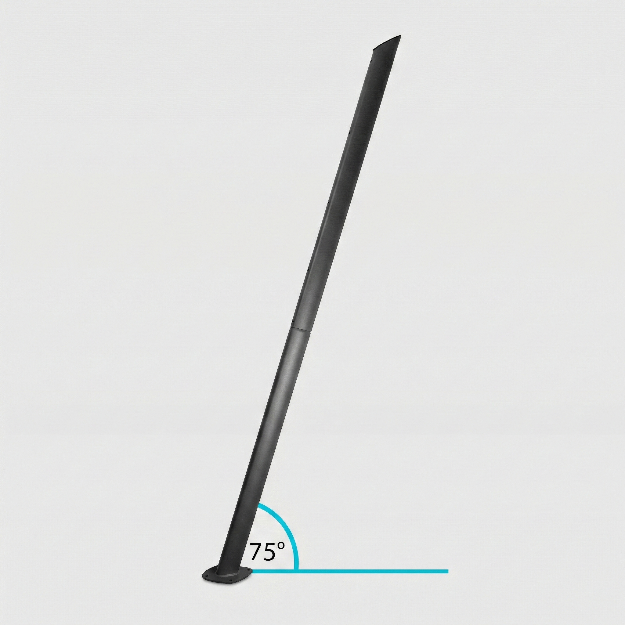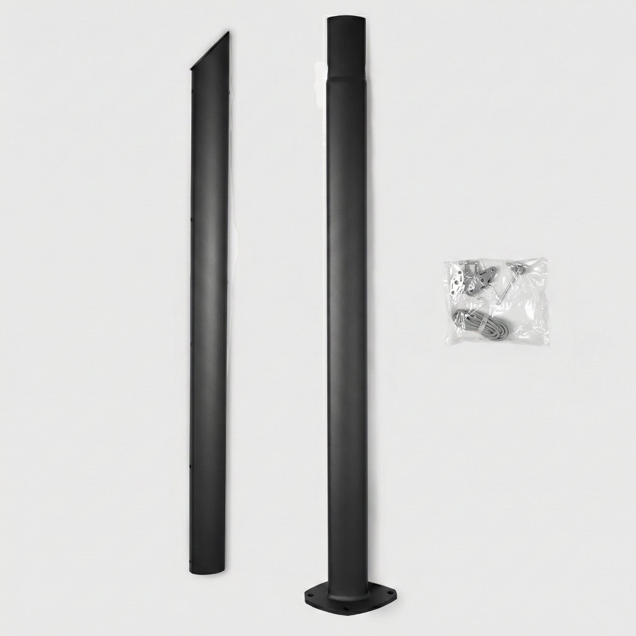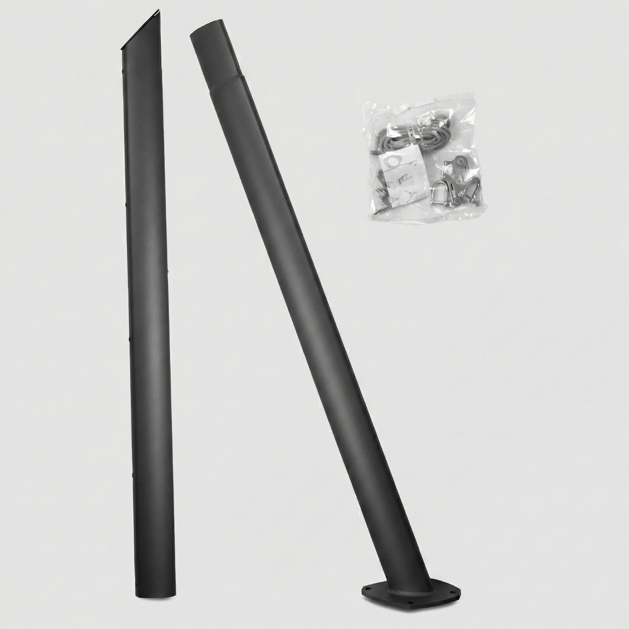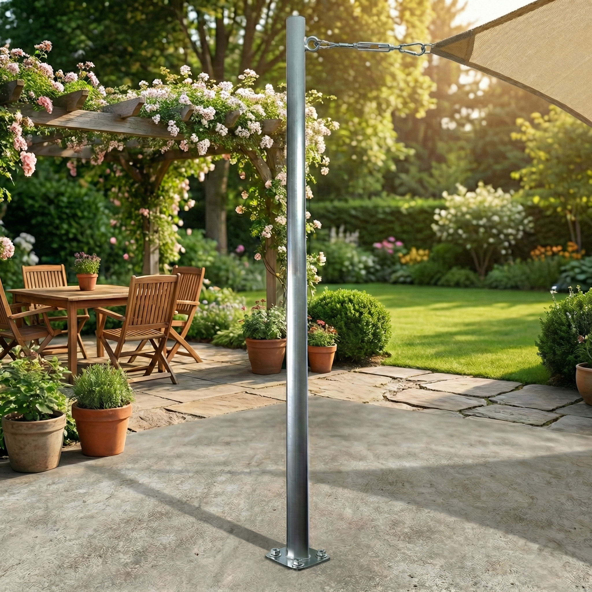 Na jednom stĺpe môžete pomocou dodávaných hákov ukotviť až 4 rôzne tieniace plachty naraz. Súčasťou balenia je robustná základová doska s hrúbkou 1 cm ktorá hravo zvládne aj náročné poveternostné podmienky. Produkt je dostupný vo verziách so sklonom 75 stupňov alebo 90 stupňov a tiež vo variante so stenovým límcom pre maximálnu flexibilitu pri montáži.