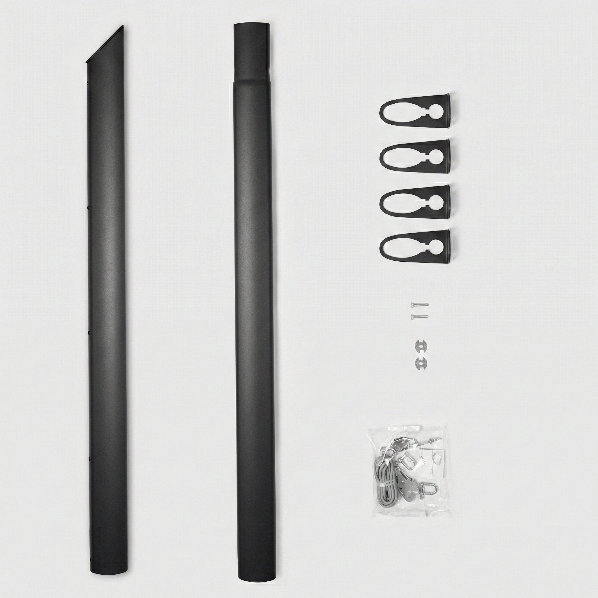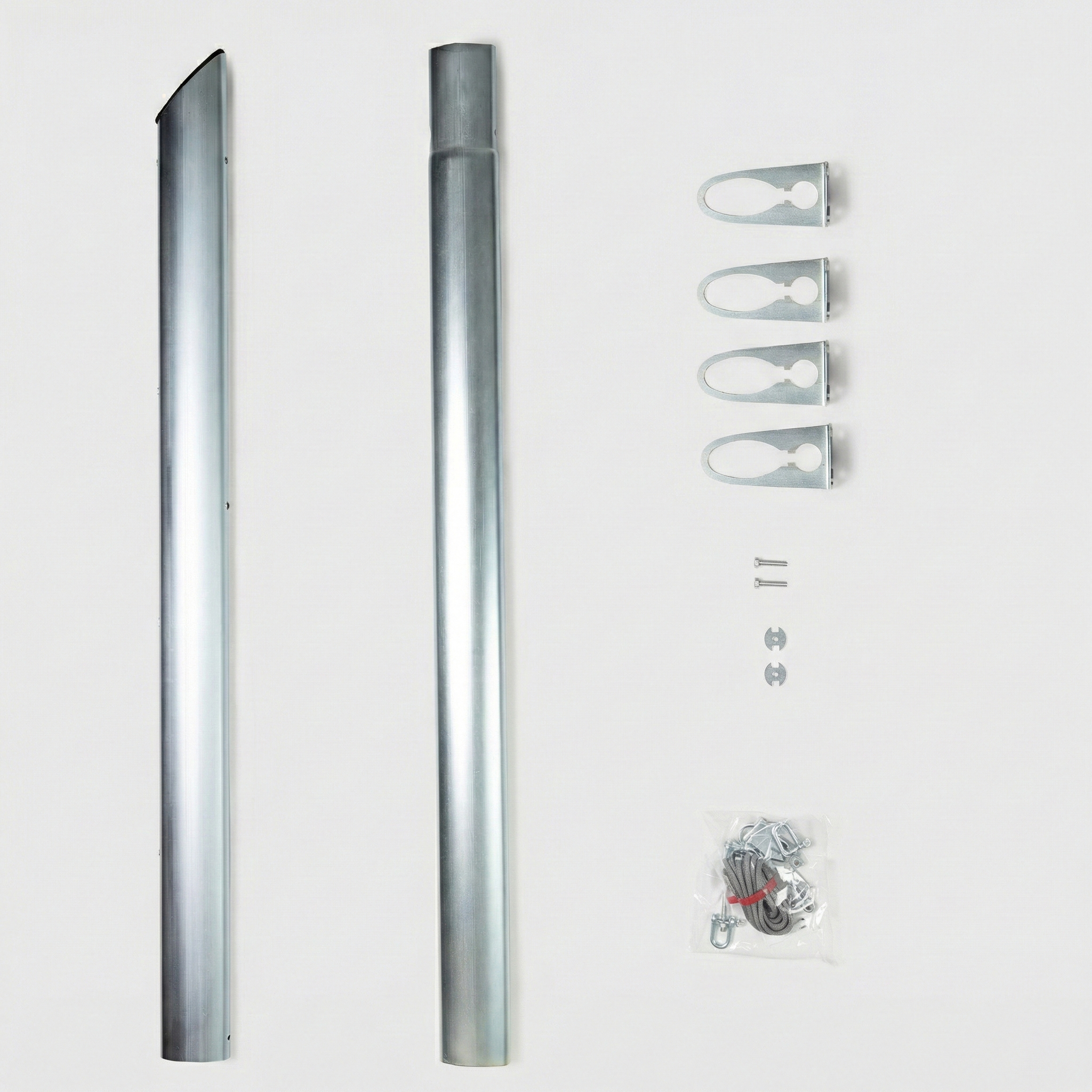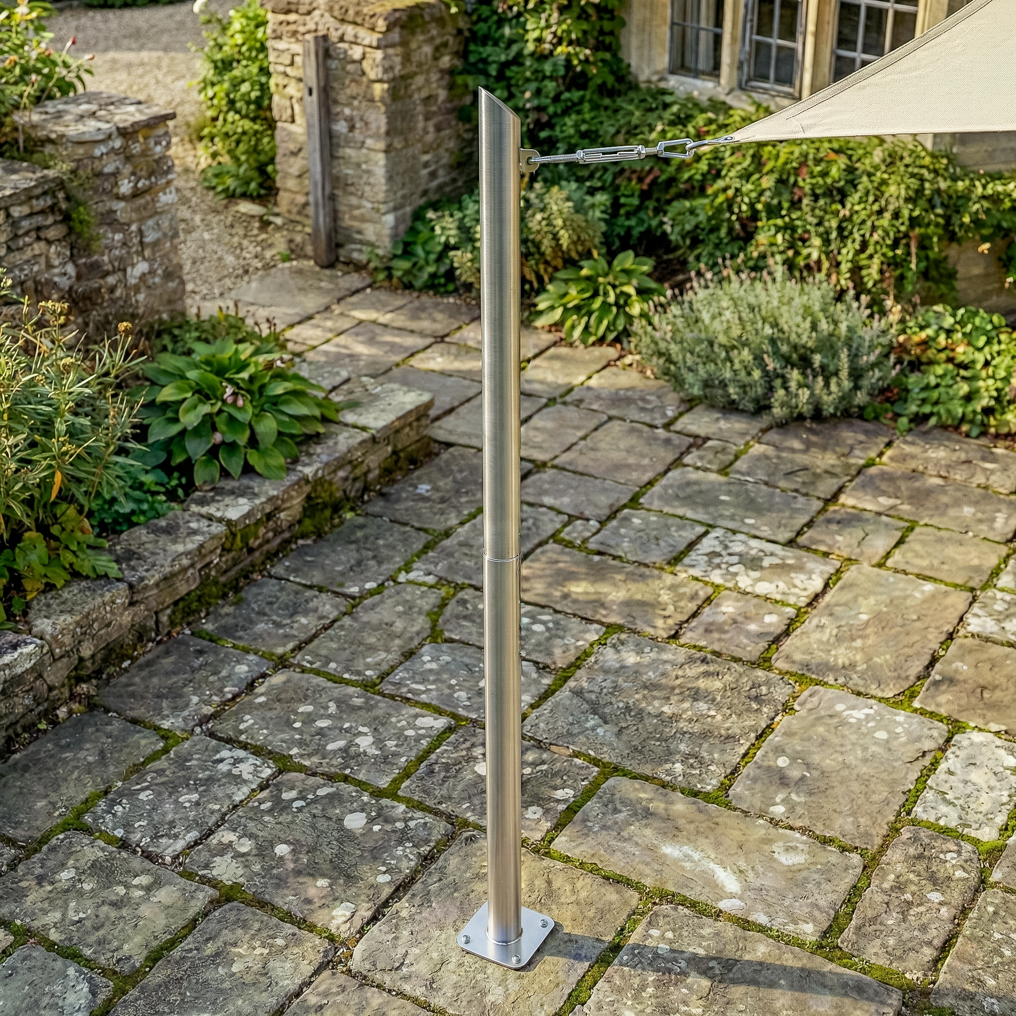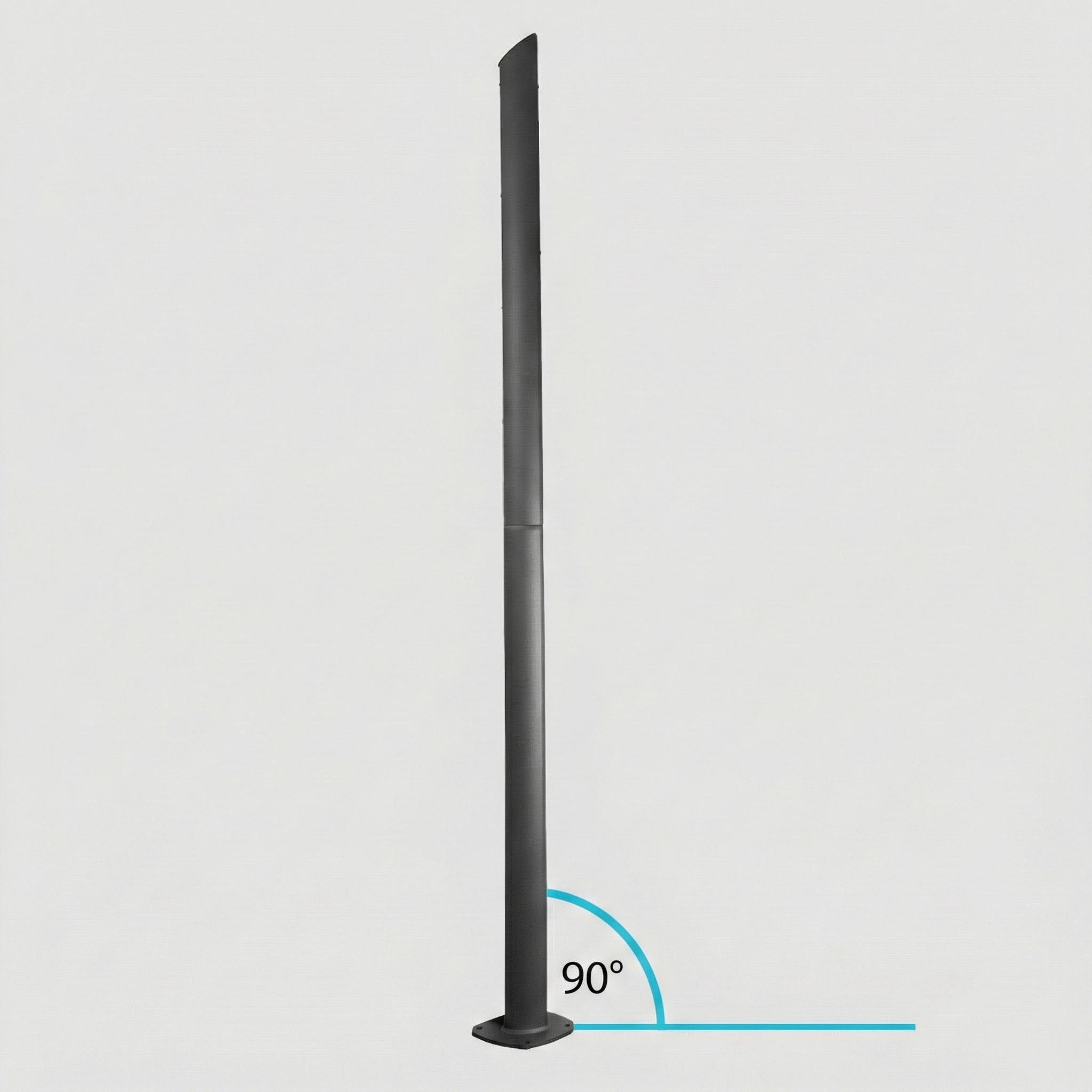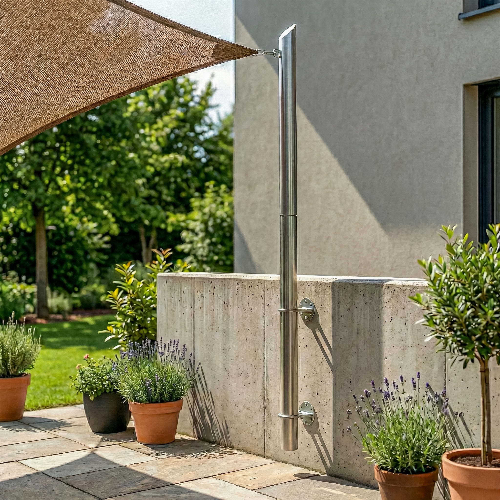 Na jednom stĺpe môžete pomocou dodávaných hákov ukotviť až 4 rôzne tieniace plachty naraz. Súčasťou balenia je robustná základová doska s hrúbkou 1 cm ktorá hravo zvládne aj náročné poveternostné podmienky. Produkt je dostupný vo verziách so sklonom 75 stupňov alebo 90 stupňov a tiež vo variante so stenovým límcom pre maximálnu flexibilitu pri montáži.