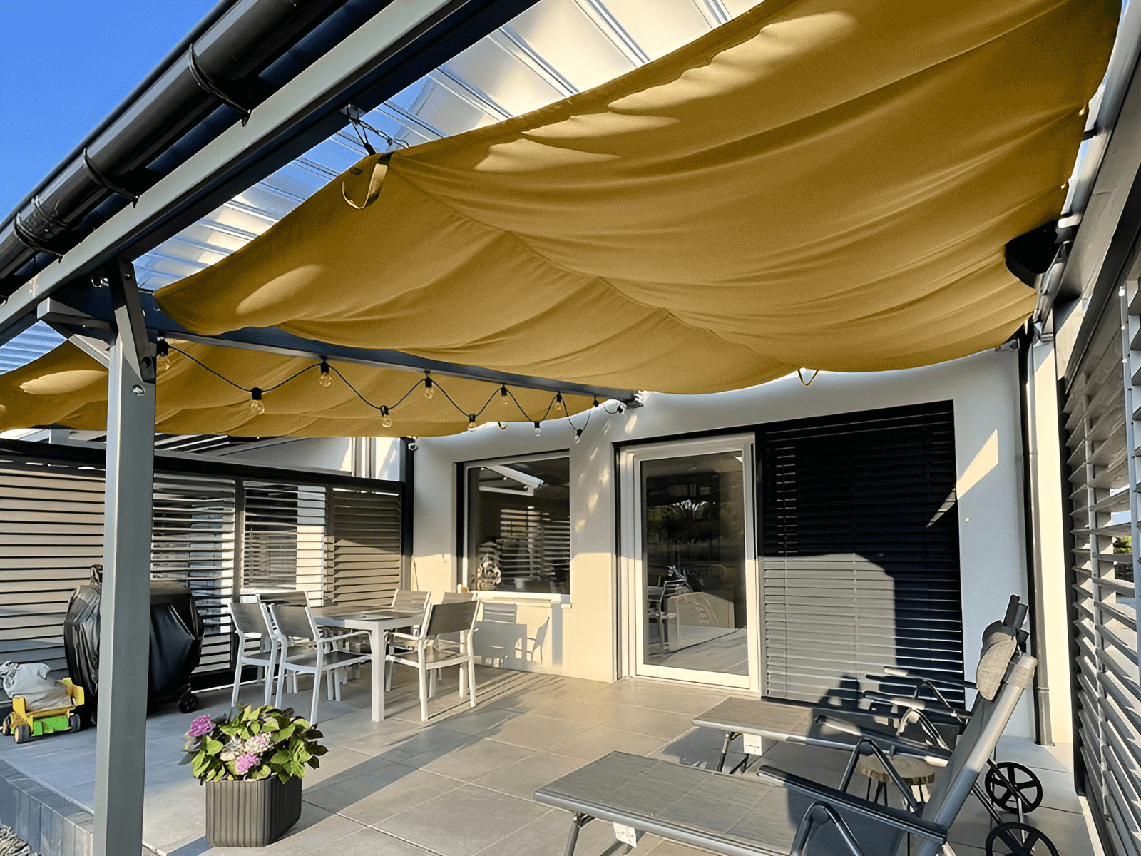 Zaťahovacie plachty z materiálu Premium Dekor vyrábame s maximálnou šírkou do 3 m a maximálnou dĺžkou 6 m.